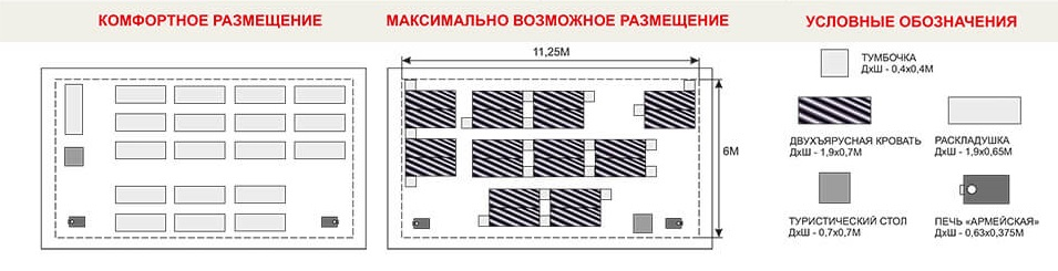 - Палатка имеет на торцах 2 входа с тамбурами, закрывающиеся при помощи клевантов, 2 отверстия в крыше для выпуска дымохода и вентиляции с защитным клапаном. На торцевых стенках расположены по два окна, на боковых стенках по пять окон из прозрачного пластика ПВХ, оснащенных противомоскитными сетками, светозащитными клапанами. Противомоскитная сетка вварена в оконный проем; прозрачный пластик ПВХ закатывается в специальные клапана. Специальный клапан имеет ширину 120 мм – 130 мм. Данная система клапана позволяет иметь 100% защиту от ветра и дождя.