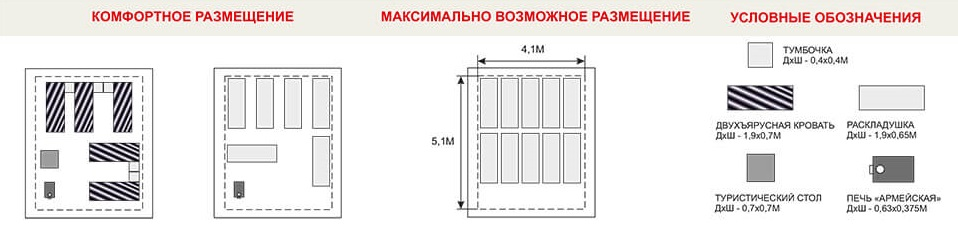 • Вместимость палатки до 10 человек на двухъярусных кроватях.