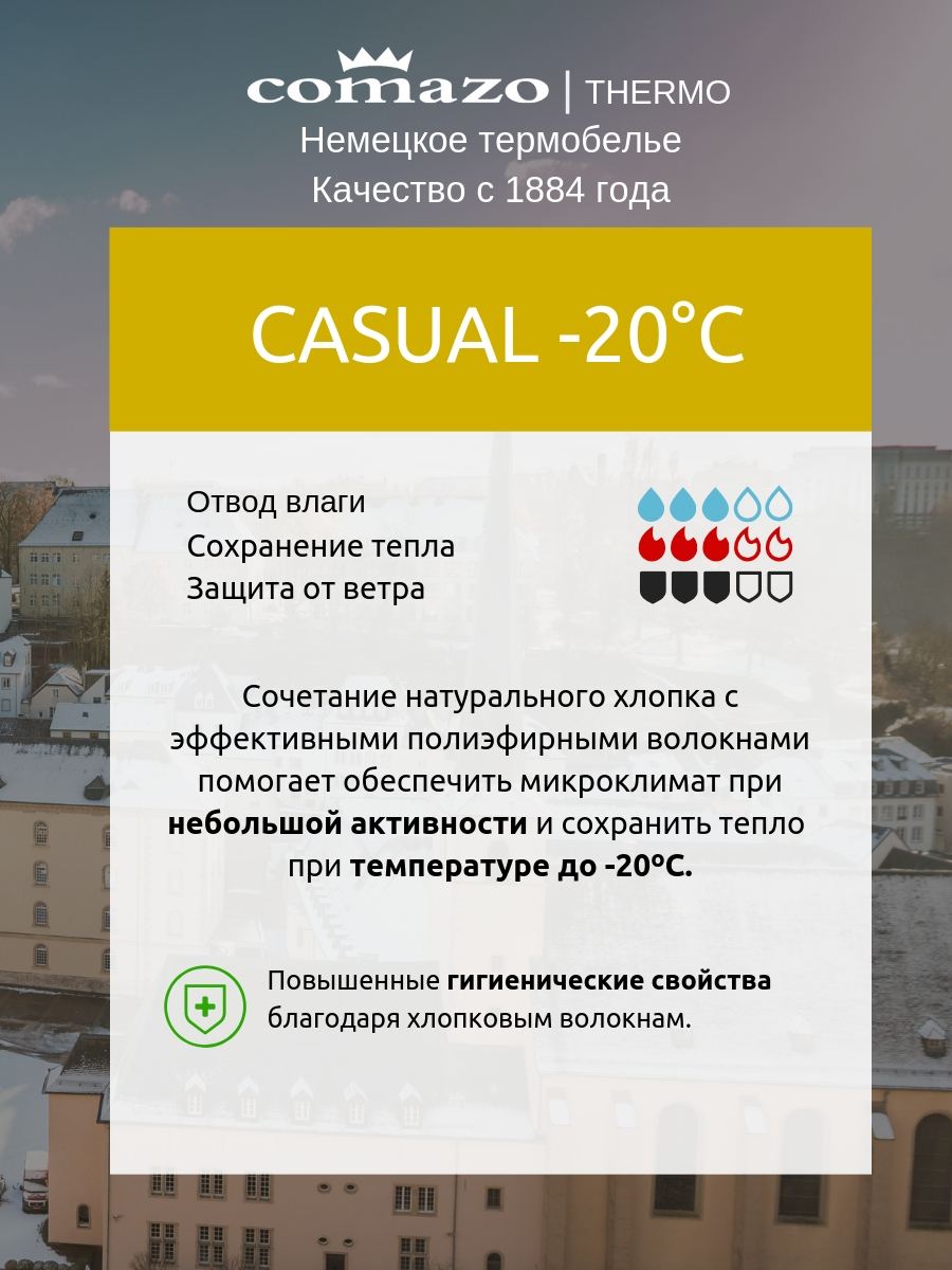 Мужские термокальсоны Comazo CASUAL -20, артикул 2/11/794. Состав: 50% хлопок, 50% полиэстер. Подходят для холодной и очень холодной погоды при низкой физической активности. Сохраняют тепло, отводят влагу, мягкие и эластичные. Обработаны антибактериальной пропиткой Sanitized, защищающей от запаха и раздражений. Плотность 260 г/м².